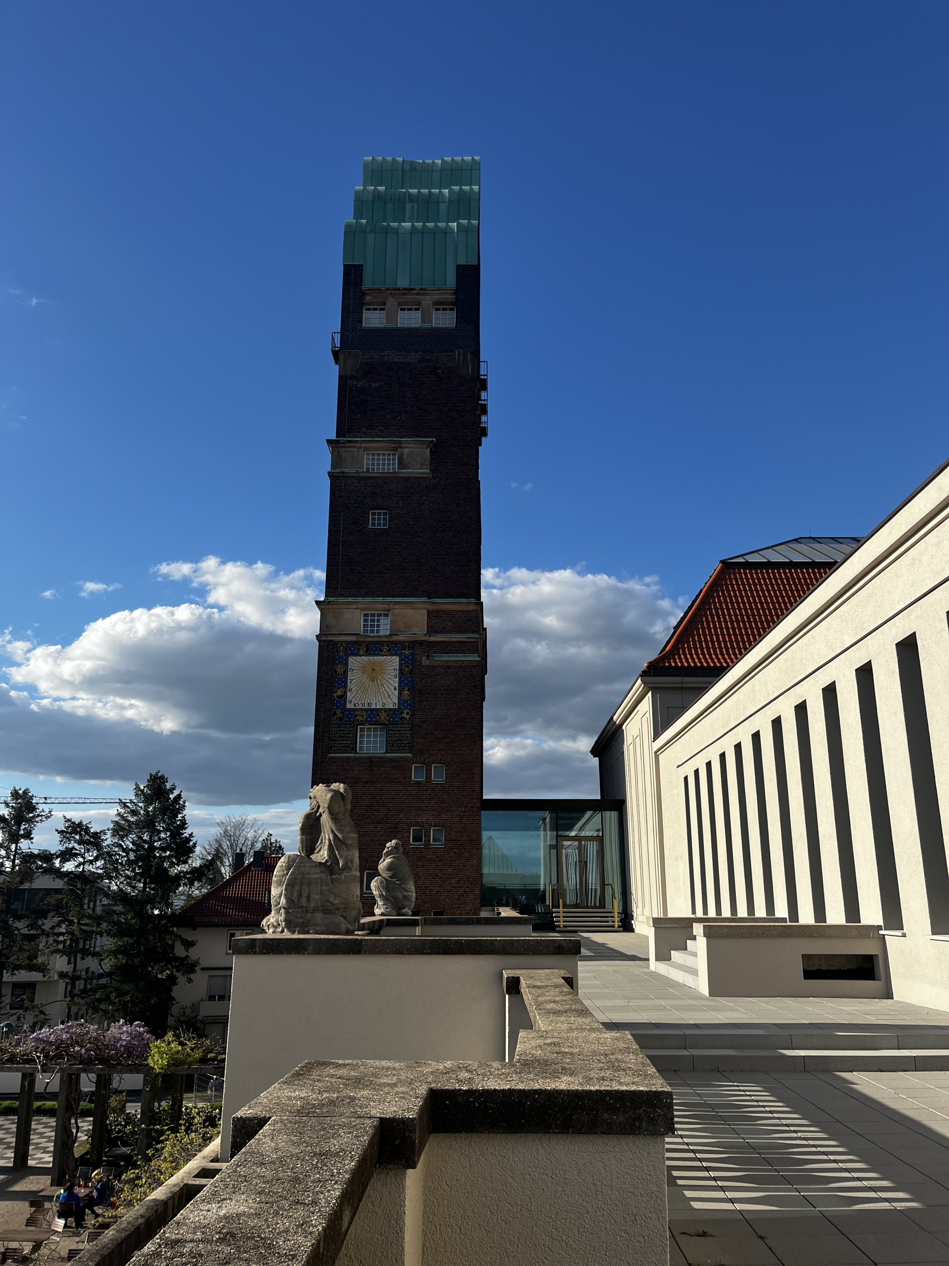 Nach den Entwürfen Olbrichs bilden die den gesamten Baukörper umspannenden, mit Wein und Rosen bepflanzten Stützen aus Gussbeton einen gestaffelten Übergang zwischen dem ansteigenden Gelände und dem höher gelegenen Ausstellungsgebäude.
